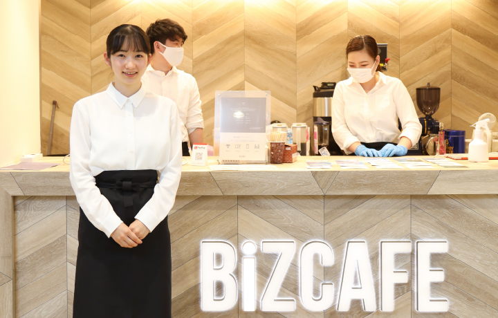 『BiZCAFE』は学生のキャリア支援の場。ドリンクの提供だけではなく、お客様とキャリアについて情報交換を行うのも私たちスタッフに期待される役割です。
