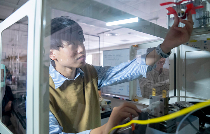 二酸化炭素を排出しないクリーンなエネルギーとして注目を集めている燃料電池。僕は大学の研究室で、この燃料電池の研究に取り組んでいます。ただ僕は、そうした一つの専門分野だけにとらわれてきたわけではありません。世界のエネルギー問題と向き合うには、多角的な視野で複数の専門性を追求する必要がある。そう考えて文理・分野を横断して開講されている授業の一つ「AI活用人材育成プログラム」を受講し、AI(人工知能)を研究データの分析や企業ビジネスの課題解決に活用するための知識やスキルを修得しました。さらに卒業後は大学院に進学し、今の研究内容をさらに突き詰めるとともに、ビジネスについての学びも深め、「自分が開発した技術をどのようにして実社会に転用できるか」の追究に挑みます。