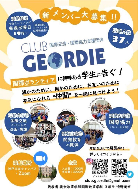 多くの方々に国際協力を身近に感じてもらい、一歩踏み出してもらうことをめざす『CLUB GEORDIE』に所属し、イベントのポスターやチラシの制作を担当。「今まで自分が参加する側でしたが、巻き込む側に回るのも面白いなと思って。これからは自分が学んできたことの発信にも力を入れようと、SDGs広報プロジェクトなどにも参加しています」