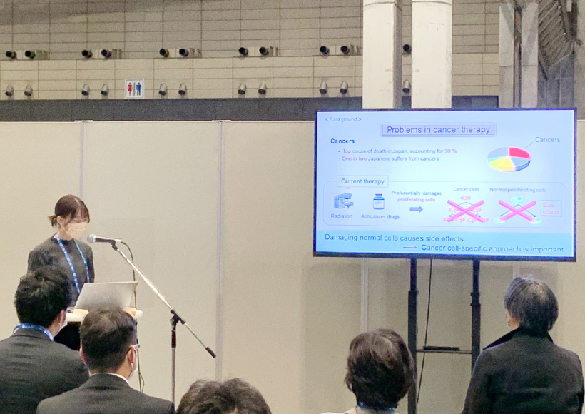 がんは日本人の死因の第一位を占める疾患です。現在の放射線や抗がん剤療法は患者さんにとって苦しい副作用を伴うため、それが根本的治療の妨げとなっています。この問題を解決しようと、私たちの研究室では副作用を抑えた新しい抗がん療法の開発に向けた基礎研究を推進しています。現在の治療法では、がん細胞に作用しつつ同時に正常な細胞にもダメージを与えてしまい、それが副作用の原因となっています。そこで私たちは「がん細胞だけにアプローチすることが重要」と考え、これを可能にするための研究を進めてきました。私自身は学部4年生から博士課程1年の現在までこの研究に打ち込み続け、論文や学会発表といった形で成果を出し、着実な手応えを感じています。