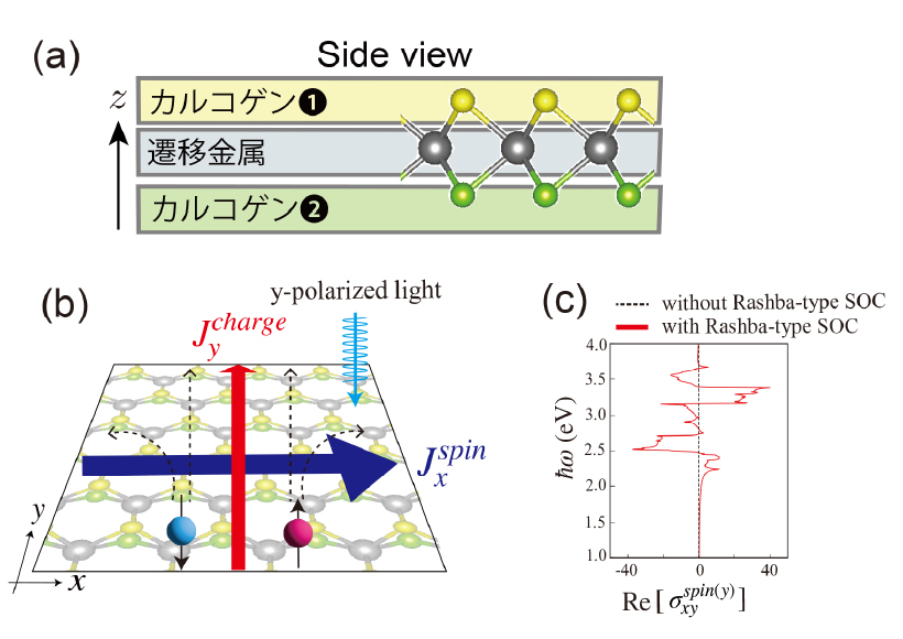 (a)二次元薄膜物質であるヤヌス遷移金属ダイカルコゲナイドの側面図。中央の遷移金属原子を二種類の異なるカルコゲン原子が挟み込む構造をとる。