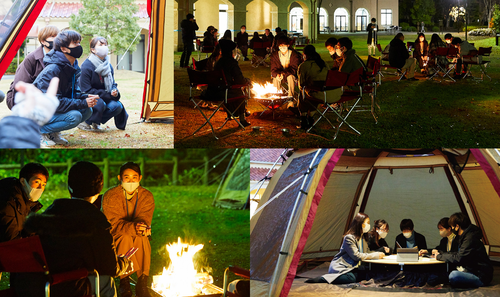 テント設営後は、グループごとに焚火を囲んでディスカッションを実施。「Camping Campus」のイメージを共有しながら、「Camping Campus」を舞台に自分たちが在学中にやってみたいこと、実現できればうれしいことなどをテーマに、それぞれの想いをぶつけあいました。自然の風や焚火の熱を肌で感じながら、学生たちは普段の教室ではあまり話せないようなことも話せ、自分や周囲を見つめ直す機会にもなったようです。特に、1年生にとってはコロナ禍において、対面で友達をつくる貴重な時間となりました。
