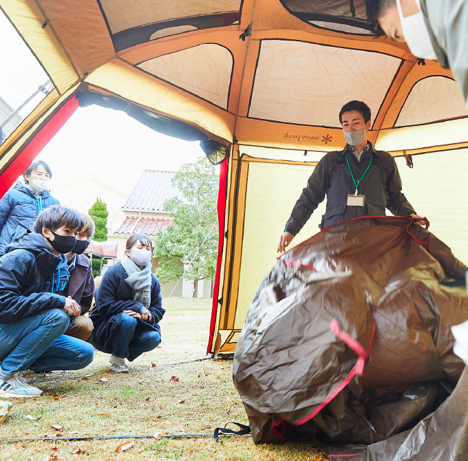 今回の「1dayキャンプ」では、学生5〜6人ずつの5グループに分かれ、まずはグループワークとしてテントの設営に取り組みました。大半が学部や学年も異なる、この日初めて出会ったグループメンバー。協力し合い、スノーピークのスタッフの指導を受けながら、テントを完成させました。普段のキャンパスとは異なる環境でのコミュニケーションや共同作業のなかで、さまざまな気づきや発見が得られたようです。