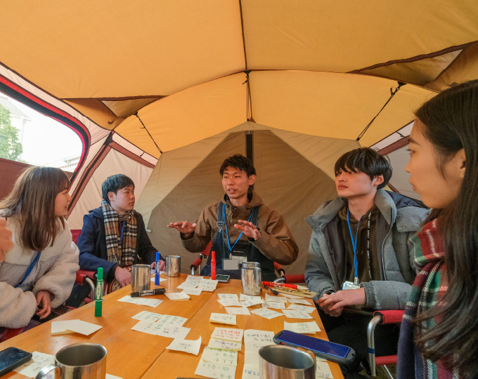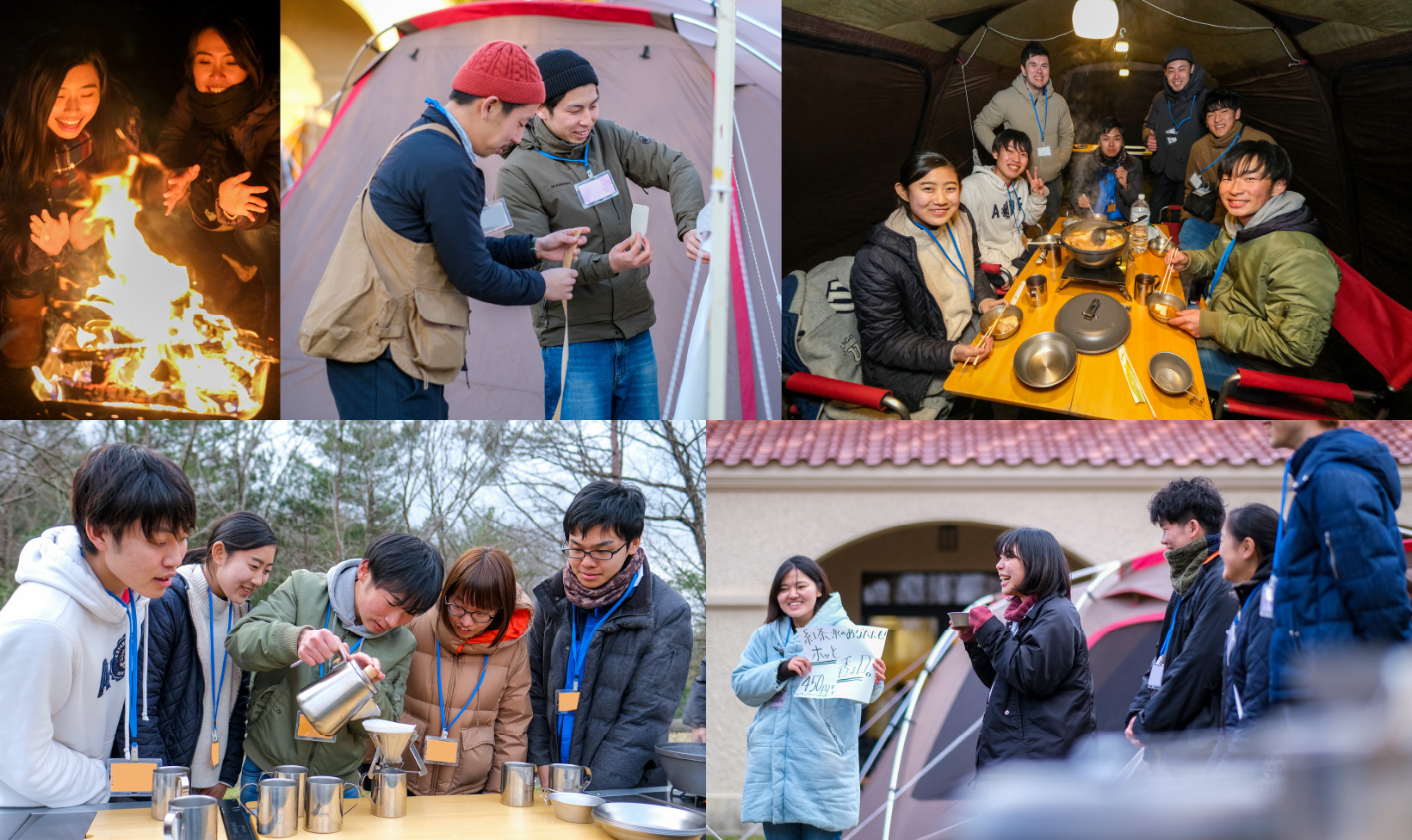 キャンプは6つのグループで分かれ、2日間を通して同じグループでディスカッションや食事を摂るスタイルで実施されました。メンバーはKSCの学生が学部、学年、男女でバラバラになるように分けられ、スノーピークの若手社員が各グループに1名ずつ参加。キャンプでのグループワークを通して、多様な壁を超えたコミュニケーションが生まれるように配慮しました。